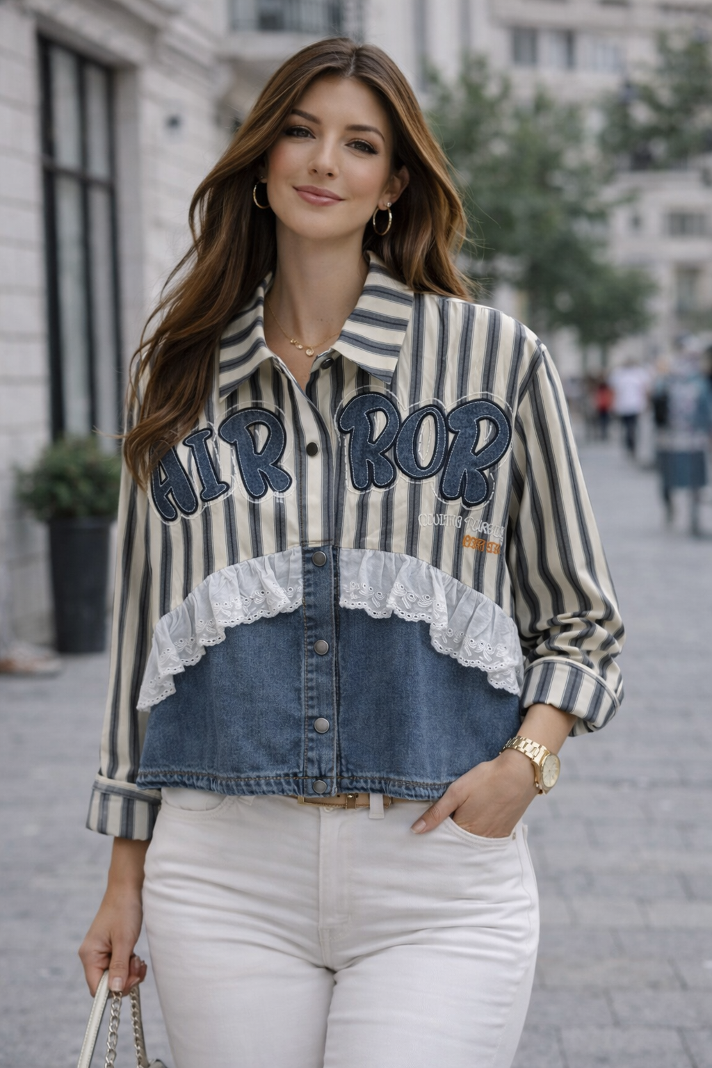 Модерен модел с яка и копчета, съчетаващ различни текстури и декоративни надписи. Допълнен с дантелен акцент за по-женствено излъчване и интересен завършек.